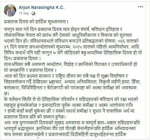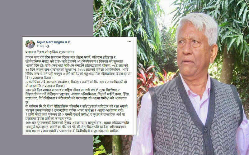 यसैबीच नेपाली कांग्रेसका नेता तथा पूर्वमन्त्री अर्जुननरसिंह केसीले फागुन सात गतेको यो दिन प्रजातन्त्र दिवस मात्र नभएर संघर्ष, बलिदान, इतिहास र लोकतान्त्रिक नेपालको प्रारम्भसँगै देशको आधुनिकीकरण र विकासको सुरुवात भएको ऐतिहासिक दिन भएको भन्दै सामाजिक सञ्जाल फेसबुक र ट्वीटरमा इमान्दारितापूर्वक आत्मा समीक्षा र आत्मा आलोचना गर्न नेतृत्वलाई सुझाएका छन् । केसीले लेखेका छन्,
