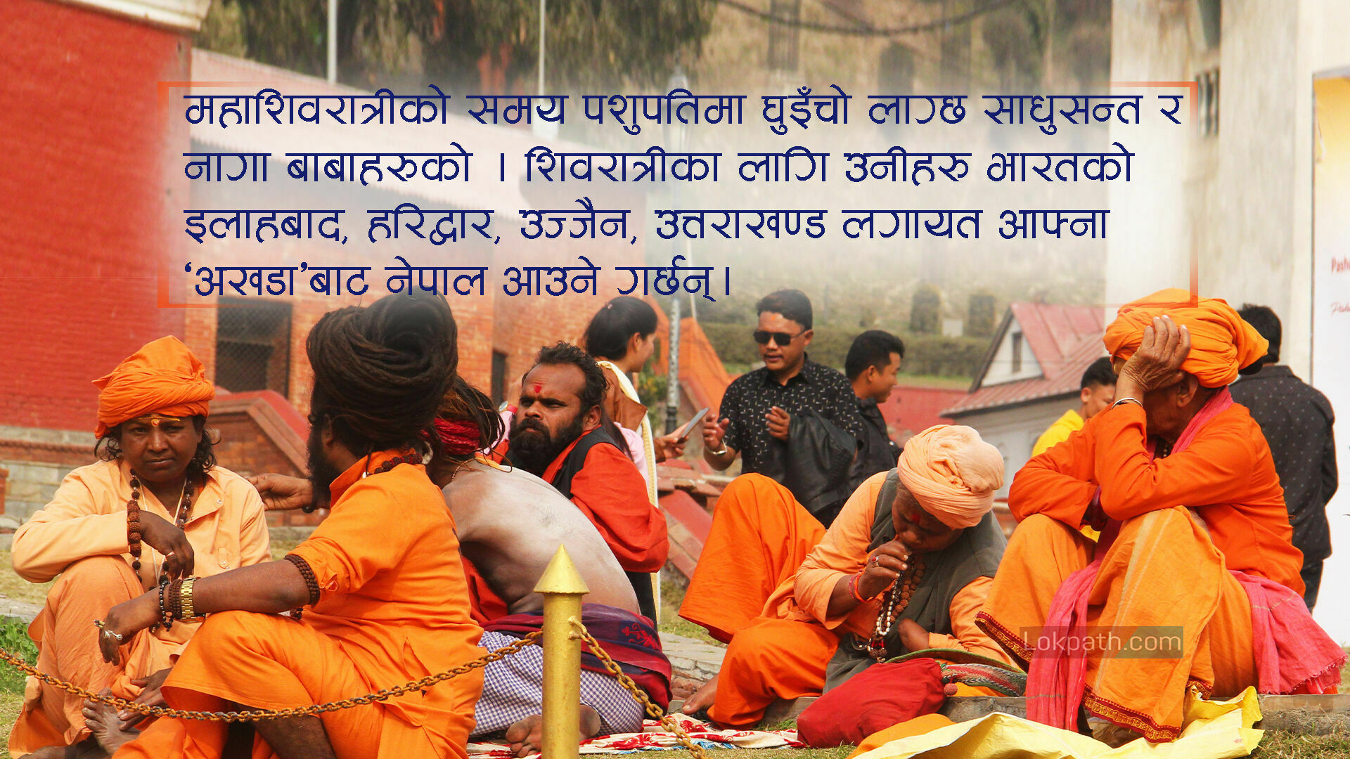 धेरैलाई थाहै छ, महाशिवरात्रीको समय पशुपतिका अर्को विशेष आकर्षण हुन् साधुसन्त र नागा बाबाहरु । शिवरात्रीका लागि उनीहरु भारतको इलाहबाद, हरिद्वार, उज्जैन, उत्तराखण्ड लगायत आफ्ना ‘अखडा’बाट नेपाल आउने गर्छन् ।