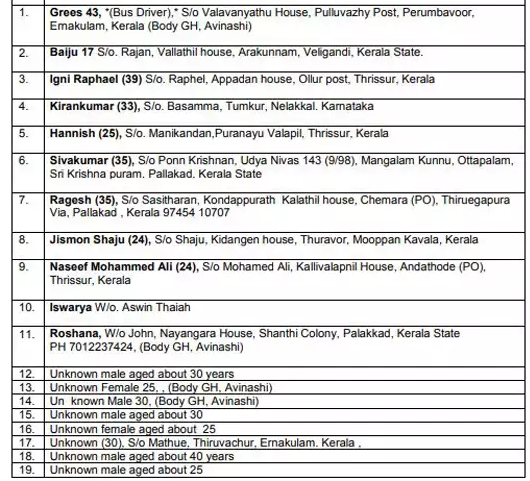 अधिकारीहरुले जनाए अनुसार दुर्घटनामा १८ जना यात्रु घाइते भएका छन् । उनीहरूलाई उपचारका लागि मोहन कुमारमंगलमा मेडिकल कलेजमा लगिएको छ । तीर्थ यात्राका लागि हिँडेको उक्त बसमा ४८ यात्रु सवार थिए । उनीहरू नेपालको सुनसरीबाट २३ माघमा ३५ दिनको लागि तीर्थयात्रामा निस्किएका थिए ।