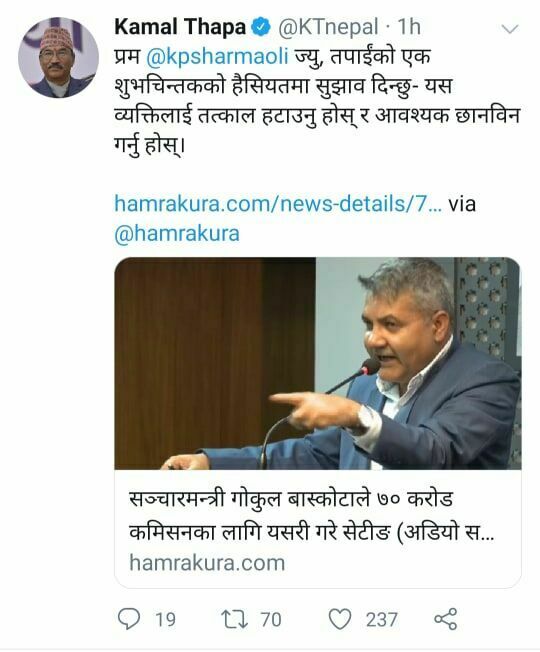 काठमाडौं- सूचना प्रविधीमन्त्री तथा सरकारका प्रवक्ता गोकुलप्रसाद बास्कोटाले सेक्युरिटी प्रिन्टीङ प्रेसको खरिदमा ७० करोड कमिसनका लागि सेटिङ गरेको अडियो बाहिरिएपछि यतिबेला नेपाली राजनीतिक वृत्त तातेको छ । धेरैले उनले तत्काल राजीनामा दिएर छानबीनमा सघाउनुपर्ने भन्दै उनकै गाउँले लवजले ‘हेप्नी’ भन्दै व्यङ्ग्य कसेका छन् ।
