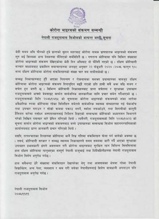 दक्षिण कोरियामा रहेका नेपालीमा समेत कोरोना संक्रमण फैलन सक्ने भन्दै सियोलस्थित नेपाली दूतावासले विशेष सावधानी अपनाउन आग्रह गरेको हो ।