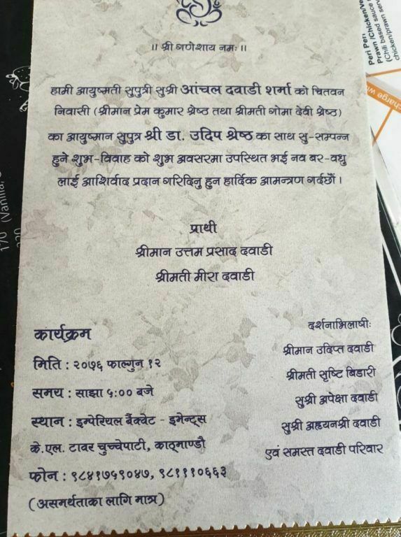 आज साँझ काठमाडौंको चुच्चेपाटीस्थित इम्पेरियल बैंक्वेटमा वैवाहिक समारोह आयोजना गरिने भएको हो । उनीहरुको वैवाहिक समारोहमा बेहुला र बेहुली पक्षका नजिकका आफन्तलाई निमन्त्रणा पठाइएको छ ।नायिका आँचलकाअनुसार सोमबार उनीहरुको इन्गेजमेन्ट भएको हो । तर, निमन्त्रणा कार्डमा भने शुभविवाहको लागि वरवधुलाई शुभकामना दिन पाहुनालाई आमन्त्रण गरिएको छ ।