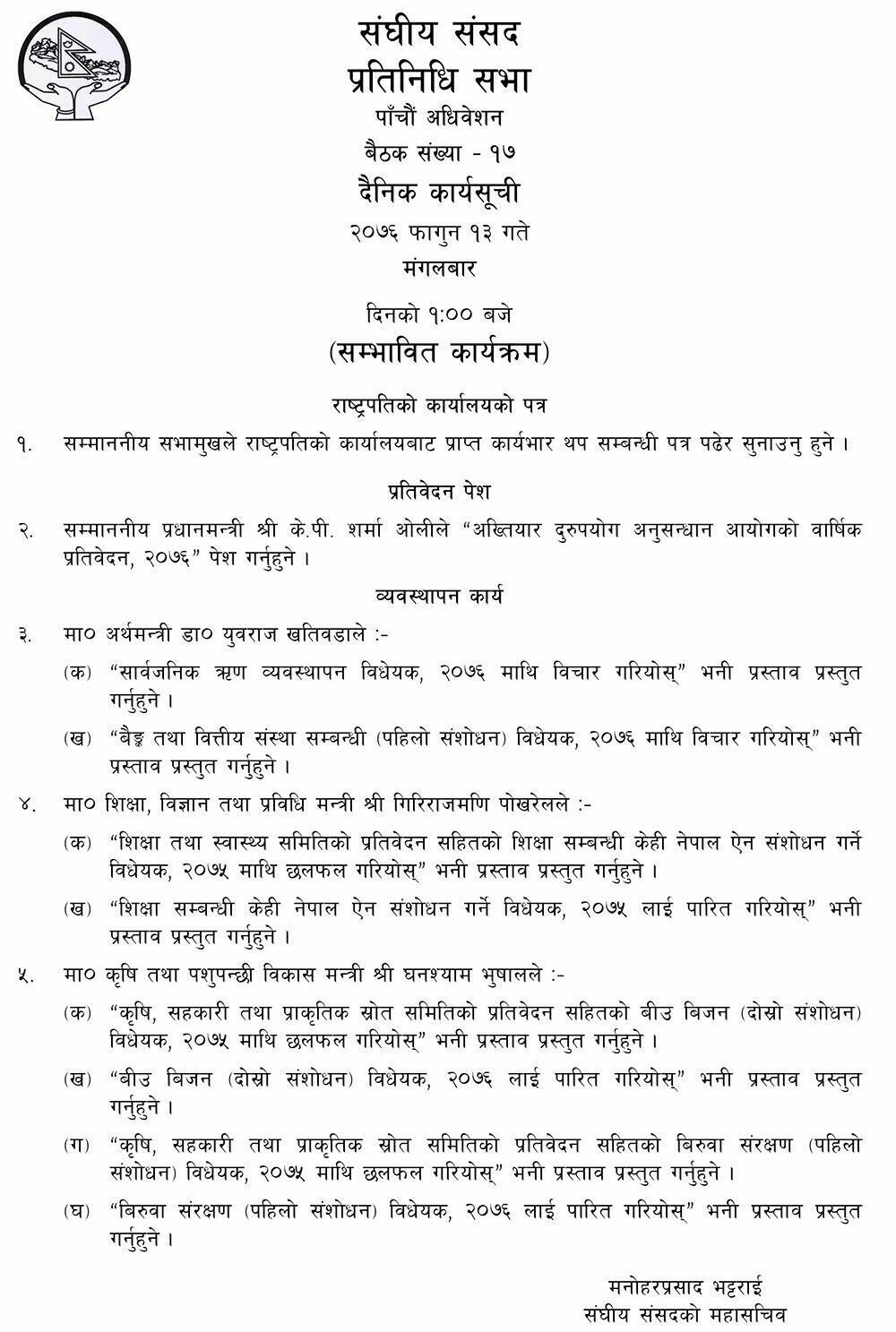 आजको बैठकमा विभिन्न विधेयक र प्रस्ताव पेश हुने कार्यसूची रहेको छ। बैठकमा अर्थमन्त्री युवराज खतिवडा, शिक्षा विज्ञान तथा प्रविधिमन्त्री गिरिराजमणि पोखरेल र कृषि सहकारी तथा पशुपन्छी विकास मन्त्री घनश्याम भुषालले विभिन्न विधेयक पारितसम्बन्धी प्रस्ताव प्रस्तुत गर्ने कार्यसूची रहेको संघीय संसदको महासचिव मनोहरप्रसाद भट्टराईले जानकारी दिए ।