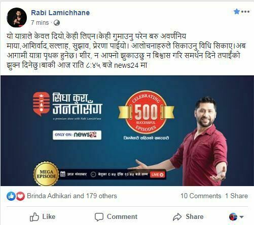 लोकप्रिय कार्यक्रम सिधा कुरा जनतासँगको ५०० औँ श्रृङ्खला आज राति ८ : ४५ बजे न्यूज २४ टेलिभिजनबाट प्रशारित हुनेछ ।