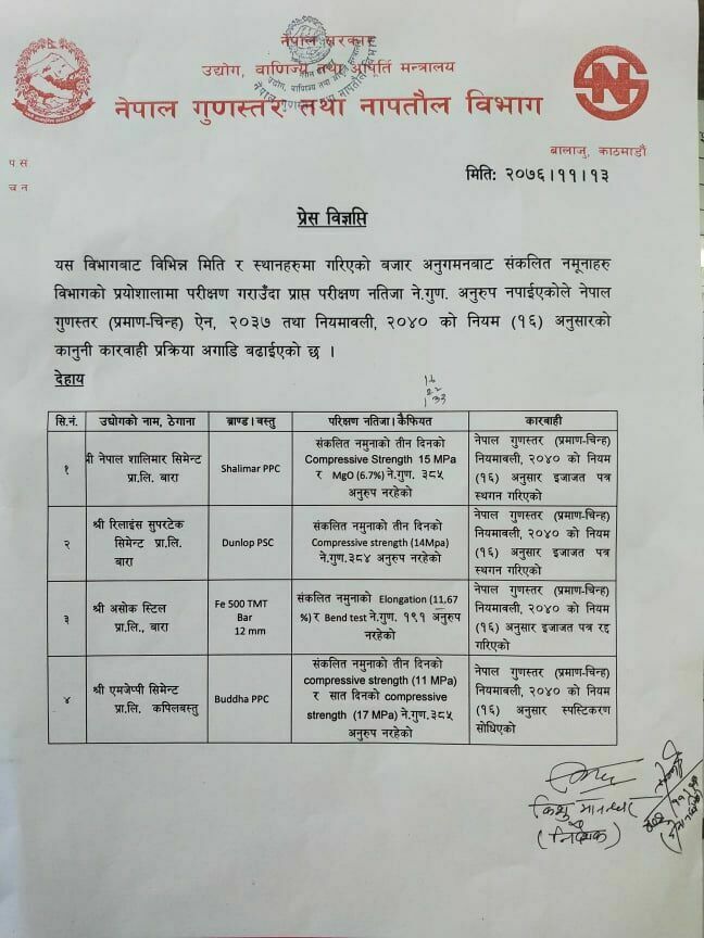 विभागका अनुसार नेपाल गुणस्तर अनुरुप नभएकाले शालिमार तथा रिलायन्स सिमेन्टको को नेपाल गुुणस्तर प्रमाण चिन्ह नियमावली २०४० को नियम (१६) अनुसार इजाजत स्थगन गरिएको छ । भने असोक स्टिलको इजाजतपत्र रद्ध गरिएको विभागले जनाएको छ । त्यस्तै एमजेप्पी सिमेन्टको अनुगमनका क्रममा संकलित नमुना गुणस्तरीय नभएकाले स्पस्टिकरण सोधिएको विभागको विज्ञप्तीमा उल्लेख रहेको छ ।