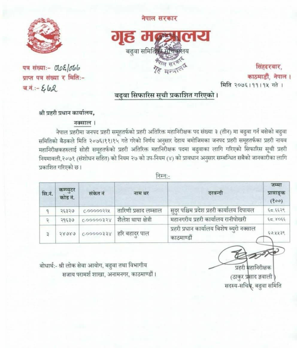 बढुवा समितिले लम्साललाई एक नम्बर, थापालाई दुई नम्बर र हरि पाललाई तेस्रो नम्बरमा राखेर बढुवा सिफारिस गरेको हो । अब उनीहरुमध्येबाटै एक जना नयाँ आईजीपी बन्ने निश्चित भएको छ ।