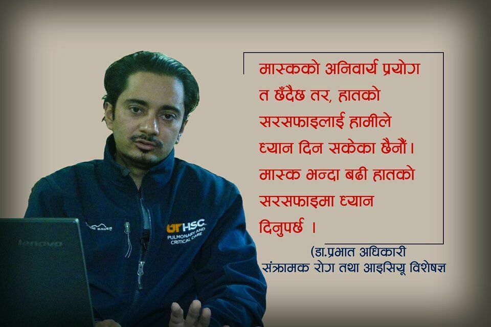 मास्क अनिवार्य हो । फेरि मास्क पनि सामान्य कपडाको मास्क वा बजारतिर बेच्न राखिने साधारण मास्कले भाइरसलाई छेक्दैन । यसले धुवाँधुलोबाट मात्र बचाउने हो । जति बाक्लो मास्क भयो उत्तिकै प्रभावकारी भन्ने गलत अवधारणा छ मानिसहरुमा ।