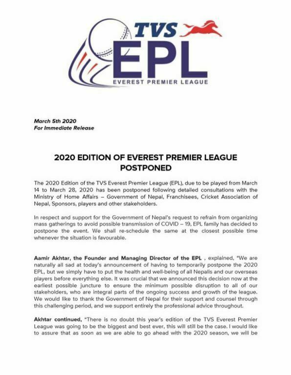 आयोजक ईपीएलले बिहिबार पत्रकार सम्मेलन गर्दै ईपीएल स्थगित गरिएको जनाएको हो ।