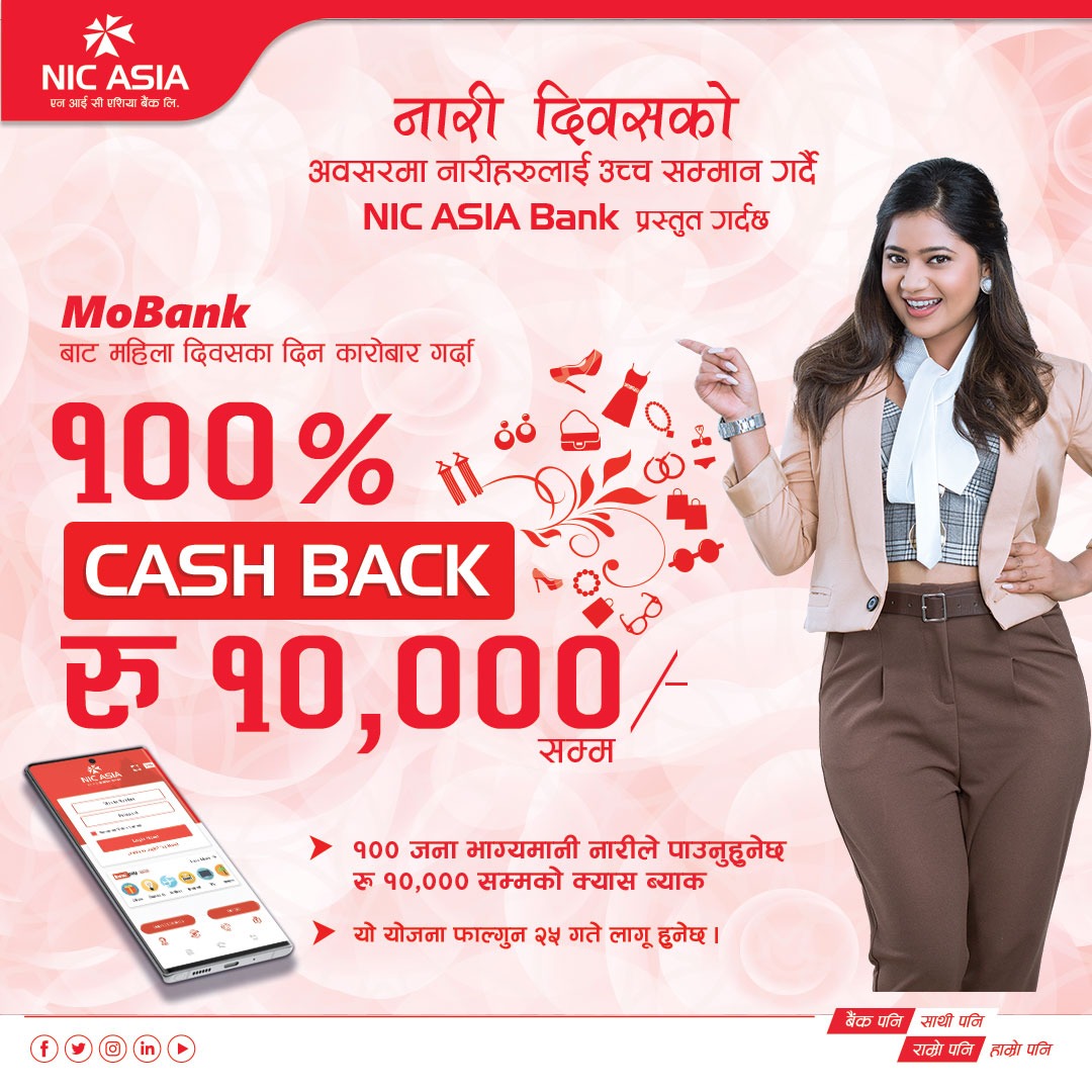 काठमाडौं । एन आई सी एशिया बैंक लिमिटेडले अन्तर्राष्ट्रिय नारी दिवसलाई लक्षित गरी बैंकका महिला ग्राहकहरूलाई विशेष योजना सार्वजनिक गरेको छ । यस योजना अन्तर्गत यस वर्षको नारी दिवसका दिन अर्थात २०७६ फागुन २५ गते यस बैंकको मोबाइल बैंकिङ्ग प्रयोग गरी कारोबार गर्ने १०० जना भाग्यशाली महिलाहरूले १०० प्रतिशत वा १० हजार रुपैयाँसम्म नगद फिर्ता प्राप्त गर्न सक्नेछन् । यस बैंकका महिला ग्राहकहरूले मोः बैंक एपबाट मोबाइल रिचार्ज गर्दा, बिजुलीको महसुल तिर्दा, हवाई टिकट खरिद गर्दा, क्यु आर पेमेन्ट लगायतका भुक्तानीहरूमा यो योजना लागू हुनेछ ।