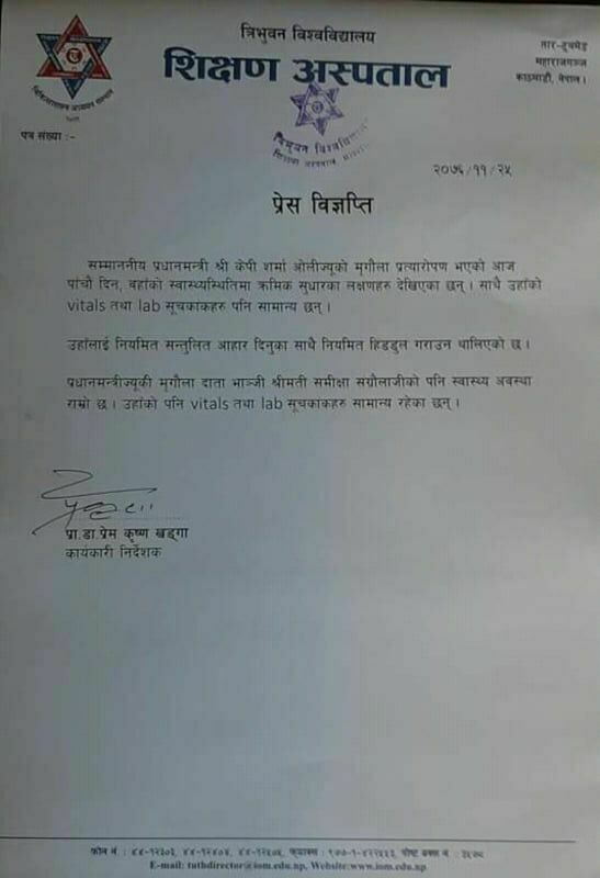 त्रिभुवन शिक्षण अस्पतालका कार्यकारी निर्देशक डा.प्रेमकृष्ण खड्काका अनुसार ओलीका भाइटल तथा ल्याव सूचकहरुले सामान्य रहेको छ ।