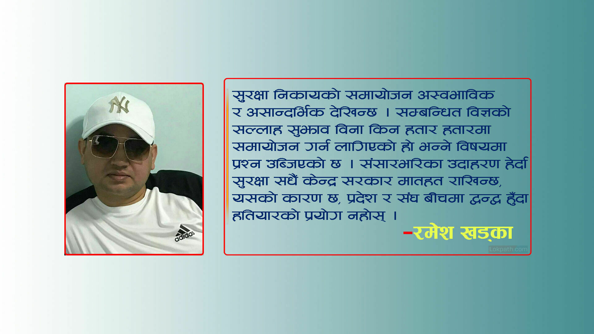 संसारभरिका उदाहरण हेर्दा सुरक्षा सधै केन्द्र सरकार मातहत राखिन्छ किनभने प्रदेश र संघ बीचमा द्वन्द्व हुँदा हतियारको प्रयोग नहोस्।
