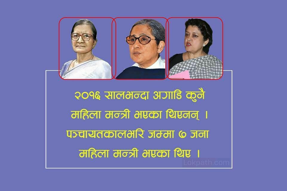 २०१६ सालभन्दा अगाडि कुनै महिला मन्त्री भएका थिएनन् । पञ्चायतकालभरि जम्मा ७ जना महिला मन्त्री भएका थिए ।
