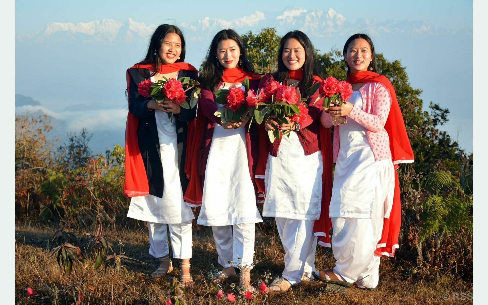 तनहुँको आँबुखैरेनी गाउँपालिका–६ स्थित जङ्गलमा फूलेको लालीगुराँससँग तस्वीर खिचाउँदै युवती । आँबुखैरेनी गाउँपालिकाका विभिन्न ठाउँमा यतिबेला लालीगुराँस फूलेको छ । रासस