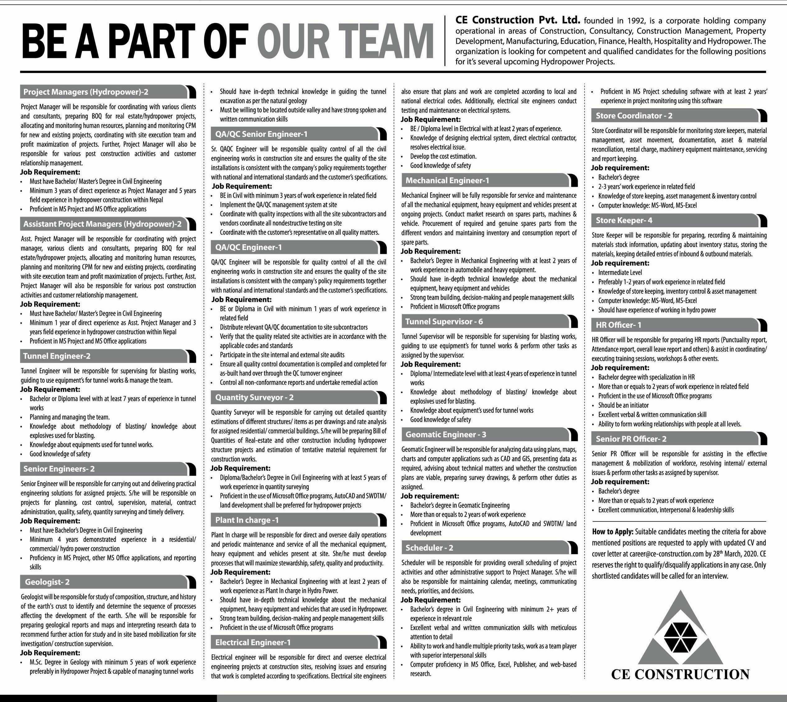 काठमाडौं । सीई कन्ट्रक्सनले ३७ कर्मचारीको माग गरेको छ । निकट भविष्यमै निर्माण हुन गइरहेको हाइड्रोपावर प्रोजेक्टको लागि सो कर्मचारी माग गरिएको हो ।