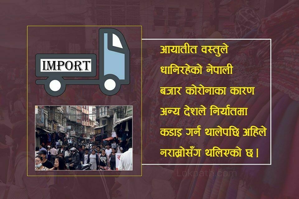आयातीत वस्तुले धानिरहेको नेपाली बजार कोरोनाका कारण अन्य देशले निर्यातमा कडाइ गर्न थालेपछि अहिले नराम्रोसँग थलिएको छ । आयातमा नेपाल सबैभन्दा धेरै निर्भर रहेको राष्ट्र भारतमै कोरोनाको संक्रमण भेटिएपछि नेपाल झन् आतंकित भएको छ । यसको प्रभाव देखिन शुरु भइसकेको छ ।