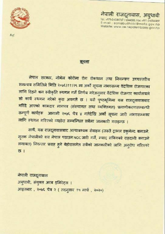काठमाडौं । बिश्वव्यापी रुपमा फैलिरहेको कोरोना भाइरसका कारण यूएईस्थित नेपाली दूतावासले श्रमिकको मागपत्र प्रमाणीकरणको काम बन्द गर्ने भएको छ ।