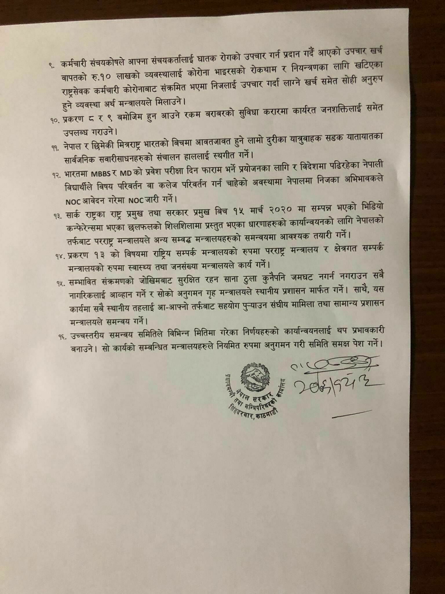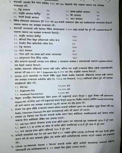 यस्तै खरिपाटीसहित विभिन्न अस्पतालमा गरी हजार बेड क्षमताको आइसोलेसन वार्डको व्यवस्था गर्ने पनि सरकारले निर्णय गरेको छ ।