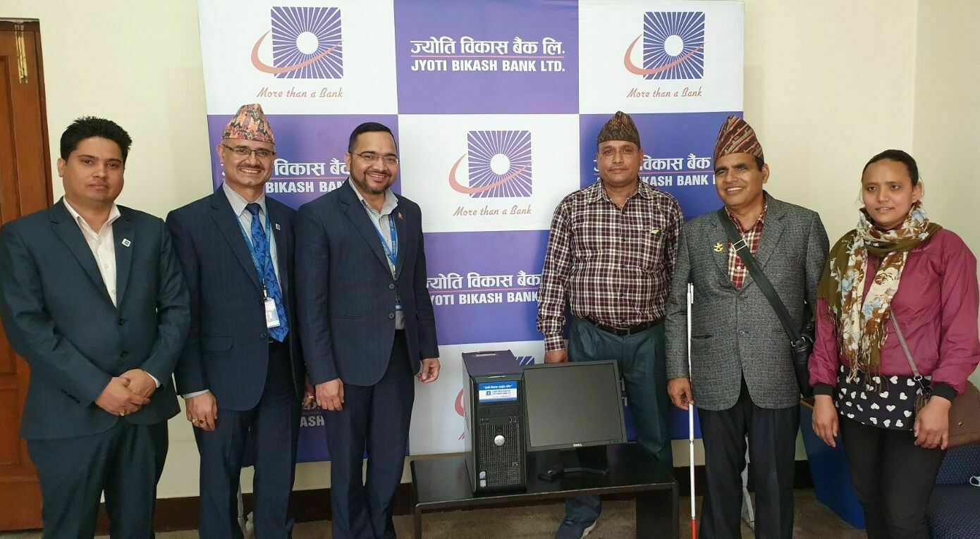 ज्योति विकास बैंकका प्रमुख कार्यकारी अधिकृत मनोज कुमार ज्ञवालीले अडियो लाइब्रेरी एण्ड रिसोर्स सेन्टर नेपालका अध्यक्ष रमेश बावु तिवारीलाई कम्प्युटरहरु हस्तान्तरण गरेका हुन् । कार्यक्रममा बैंकको तर्फबाट बैंकका नायब महाप्रबन्धक पारस राज कँडेल, सहायक महाप्रबन्धक रामहरि आचार्य तथा संस्थाका उपाध्यक्ष कोपिला गुरुङ र सल्लाहकार सदस्य डा गोविन्द आचार्यको पनि उपस्थिति रहेको थियो।