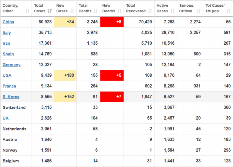 यो समाचार तयार पार्दासम्म विश्वभर ८ हजार ९ सय ६७ जनाको मृत्यु भइसकेको छ । २ लाख १९ हजार २ सय ४३ केसहरु देखिएको छ । यो संक्रमितको संख्या हो । ८५ हजार ७ सय ४५ जनामा संक्रमण भएर उपचारपछि स्वास्थयलाभ गरी घर फर्किएका छन् । यो रोग १ सय ७६ देशमा फैलिएको छ ।
