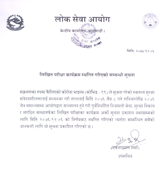 चैत ८ गतेबाट चैत मसान्तसम्म आयोगद्वारा सञ्चालन हुने सबै परीक्षा स्थगित हुने भएको हो । आयोगले सञ्चालन गर्ने पूर्व निर्धारित निजामति सेवा, सुरक्षा निकाय, संगठित संस्था तर्फका सम्पूर्ण लिखित परिक्षाहरु अर्को सूचना नभएसम्म स्थगित गरेको हो ।