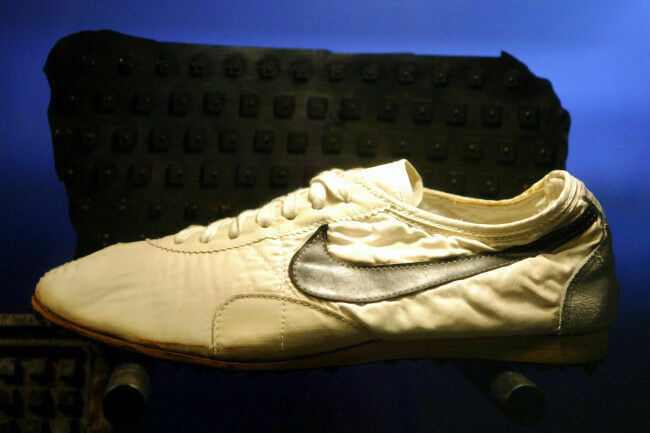 Nike “Moon Shoe” worn by Mark Covert in the 1972 U.S. Olympic Trials at Niketown Eugene in Eugene, Ore. The waffle-soled shoes were made from Bill Bowerman in a waffle iron and were the first Nike shoes worn durinig competition. (Photo by Kirby Lee/WireImage)