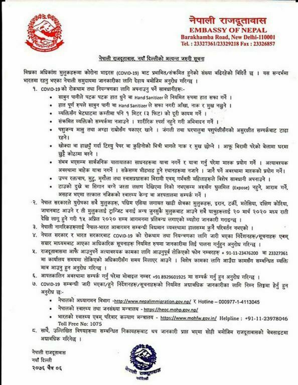 काठमाडौं । कोरोना महामारीबाट बच्न दिल्लीस्थित नेपाली दूतावासले प्रवासी नेपालीहरुलाई लक्षित गर्दै सूचना जारी गरेको छ । एक विज्ञप्ति जारी गर्दै हिजो दिल्लीस्थित दूतावासले कोरोना महामारीबाट बच्न अप्नाउने उपायसहित प्रवासी नेपालीहरुलाई अनुरोध गरेको हो । दूतावासले कोरोना रोकथाम र नियन्त्रणका लागि उपाय, नेपाल सरकारले चालेका पछिल्ला कदम, राजदूतावासको हटलाइन फोन, आपतकालीन अवस्थामा सम्पर्क गर्नुपर्ने मोबाइल नम्बर लगायतलाई समेटेर ८ बुँदे सूचना जारी गरेको छ । हेर्नुहोस् सूचना