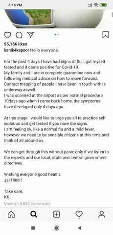 उनले लेखेकी छिन्, ‘केही हप्तादेखि मलाई रुघाखोकी लागेको थियो र जाँच गराउँदा कोराना देखिएपछि म र मेरो परिवार अहिले सुरक्षित क्वारेनटाइनमा बसेका छौं ।’ कनिका कपुर बलिउडकी चर्चित गायिका हुन् उनले बेबी डल, चिटियाँ कलैया जस्ता सुपरहिट गीत गाएकी छिन् ।
