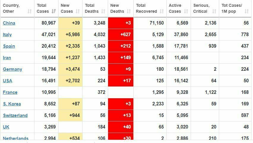 विश्व स्वास्थ्य संगठनका अनुसार स्पेनमा पनि भाइरसबाट एकै दिन २१२ जनाको मृत्यु भएको छ भने इरानमा १४९ जनाको मृत्यु भएको छ । स्पेन र इरानमा मृतको संख्या क्रमशः १ हजार ४३ र १४ सय ३३ पुगेको छ ।