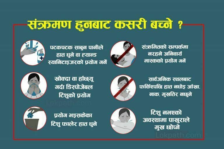 ५. इन्फेक्टेड वा अन्जान व्यक्तिसँग धेरै समयसम्मसँग नबसौँ । कोहि पनि व्यक्तिसँग हात मिलाए पछि साबुन पानीले राम्रोसँग हात धोऔँ ।