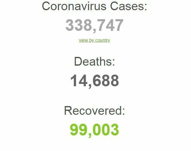 काठमाडौं । विश्वकै निमित्त ठूलो स्वास्थ्य चुनौती बनेको कोरोना भाइरसका कारण अहिलेसम्म १४ हजार ६सय ८८ जनाको मृत्यु भइसकेको छ । त्यस्तै, ३ लाख ३८ हजार ७४७ जनालाई संक्रमण भएको छ । ९९ हजार ३ जना निको भएर घर फर्किएका छन् ।