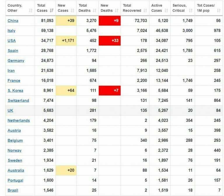 अहिलेसम्म १९२ देशमा संक्रमण फैलिएको छ । चीनको वुहान शहरबाट शुरु भएको भाइरसका कारण इटालीमा अहिलेसम्म ५ हजार ४७६ जनाको मृत्यु भएको छ । चीनमा भने ३ हजार २७० जनाको मृत्यु भएको छ । त्यस्तै, इरानमा १६ सय ८५ जनाको मृत्यु भएको छ । अमेरिकामा ४५२ र स्पेनमा १७ हजार ७२ जनाको मृत्यु भइसकेको छ ।