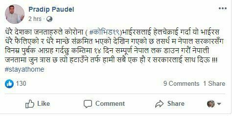 सामाजिक सञ्जाल फेसबुकमा सरकारलाई सुझाव दिँदै पौडेलले लेखेका छन्, “कम्तिमा १४ दिन सम्पूर्ण नेपाल लक डाउन गरौं नेपाली जनतामा जुन त्रास छ त्यो हटाउँने तर्फ हामी सबै एक हौ र सरकारलाई साथ दिऊ” ।