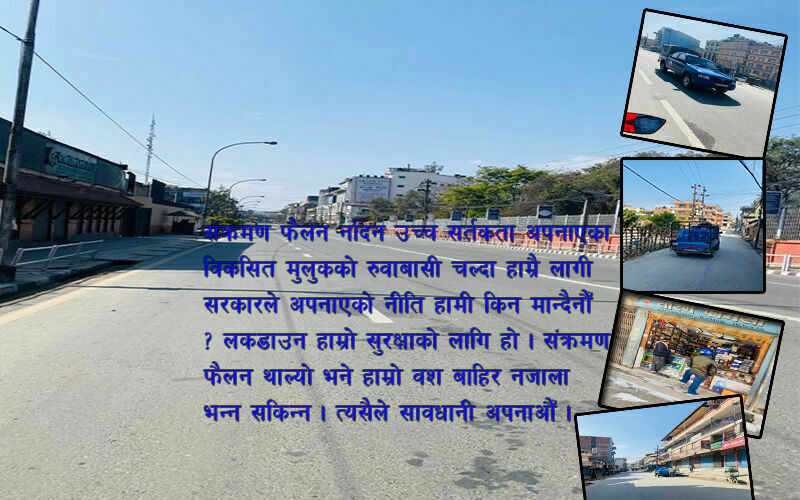 काठमाडौं – सरकारले आजदेखि देशैभर ‘लकडाउन’ गरेको छ । कोरोना भाइरस ‘कोभिड १९’ को संक्रमण फैलिन नदिन देशैभर सर्वसाधारणलाई आउजाउमा रोक लगाएको छ । विकसित मूलुकहरुले पनि यो नीति अपनाएका छन् । तर केहि मानिसहरु सरकारको यो नीति विपरित मनिङ वाक जाने, हिँडडुल गर्ने, भेटघाट गर्ने काम गरिरहेका छन् । तर विकसीत मुलुकहरु आज कुन हालतमा पुगेका छन् ? यो हविगत हामीले व्यहोर्नु पर्यो भने ? त्यसैले सरकारले अपनाएको नीतिमा साथ दिनु सचेत नागरिकको दायित्व हो । हामी जहिल्यै अरुको टाउकोमा दोष थोपार्छौ तर आफू जिम्मेवार बन्नुपर्ने ठाउँमा हेक्का राख्दैनौँ । उल्लंघन गर्छौ भने हामीले आफू , आफ्नो परिवार समाज र राष्टको लागि केहि पनि दिन सक्दैनौँ, नोक्सानी सिवाय । सोचौँ । सावधान होऔँ । सचेत बनौँ ।