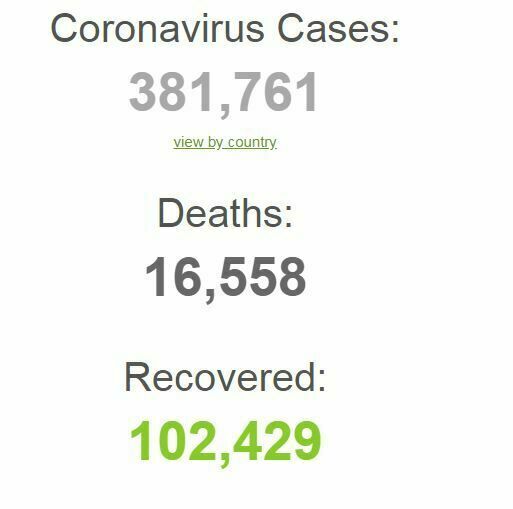 काठमाडौं । विश्वकै निमित्त ठूलो स्वास्थ्य चुनौती बनेको कोरोना भाइरसका कारण अहिलेसम्म १६ हजार ५ सय ५८ जनाको मृत्यु भइसकेको छ । त्यस्तै, ३ लाख ८१ हजार ७६१ जनालाई संक्रमण भएको छ । १ लाख २ हजार ४२९ जना निको भएर घर फर्किएका छन् ।