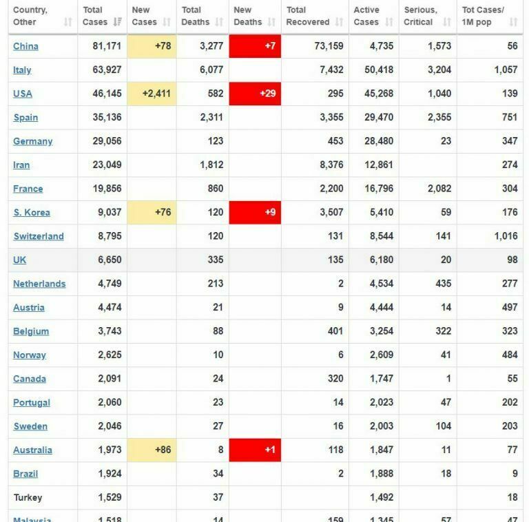 अहिलेसम्म कोरोना भाइरसको सङ्क्रमणले दुई हजार ८ सय ३२ जनाको ज्यान गएको छ । यस्तै ७९ हजार एक सय ६७ जनामा कोरोना भाइरसको सङ्क्रमण पुष्टि भएको छ । चीनपछि इरानमा सबैभन्दा धेरै २६ जनाको ज्यान गएको छ ।