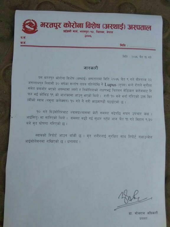 उनी पहिलेदेखि नै लुपुस भन्ने रोगले मिर्गौलामा समेत समस्या देखिए पछि गत चैत ९ गते चितवन मेडिकल कलेजमा भर्ना भएका थिए । कोरोना भाइरसको आशंकामा उनलाई सोमबार राति कोरोना विशेष अस्पतालमा रिफर भएका थिए ।‘यादव पहिलेदेखि नै लुपस भन्ने रोगले मिर्गौला समेत कमजोर भएको अवस्थामा ज्वरो र निमोनियाको लक्षण भइ चितवन मेडिकल कलेजबाट रिफर भइ कोभिड १९ को आशंकामा आएका थिए’, डा.अधिकारीले जारी गरेको विज्ञप्तिमा भनिएको छ, ‘राति १० बजे भर्ना गरिएको उक्त विरामीको स्वाब (नमुना कलेक्सन) १० गते गते नै गरी काठमाडौं पठाइएको छ ।’