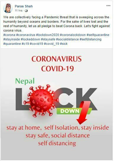 पूर्व युवराज शाहले फेसबुकमा लेखेका छन्, “हामी सामूहिक रूपमा महामारीको खतराको सामना गर्दैछौं जुन समुद्र र सीमाना भन्दा पर मानवतामा व्यापक छ। जीवन र बाँकी मानवता को खातिर, हामी सबै कोरोना फिर्ता हराउन प्रतिज्ञा। कोरोना भाइरस बिरूद्ध लडौं।”
