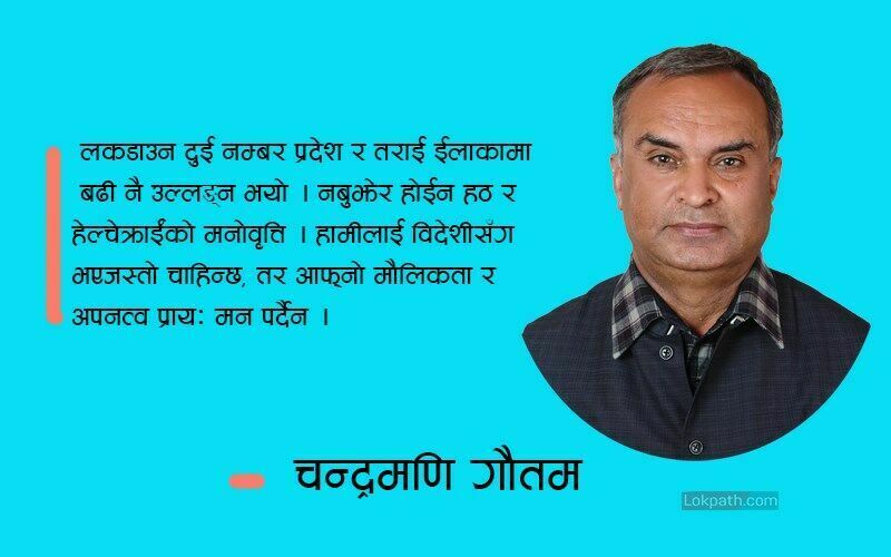 चैत ११ गते एकहप्ताका लागि कोरोना भाईरसविरुद्ध घोषित तालाबन्दी (लकडाउन) दुई नम्बर प्रदेश र तराई ईलाकामा बढी नै उल्लङ्घन भयो । नबुझेर होईन हठ र हेल्चेक्राईँको मनोवृत्ति । यो हाम्रै जीवन र स्वास्थ्यका लागि लागु गरिएको हो भन्ने थाहा छ र अनुशासनहिन र अराजकतावादी मनोवृत्ति वा चरित्रको प्रस्तुति ! भारतमा २२ राज्यमा लगाईएको लकडाउनलाई अनुशासनहिन जनताले उल्लङ्घन गरेको कारण ३१ राज्यको सिंगो भारतमा चैत १२ गते १२ बजेदेखि लागु हुनेगरी कर्फ्यू नै घोषित गर्नुप-यो ।