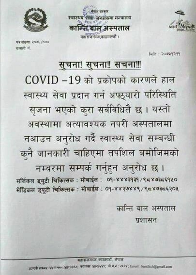 काठमाडौं । कान्ती बाल अस्पतालले अत्यावश्यक नपरिकन अस्पतालमा नआउन एक सूचना प्रकाशित गर्दै सम्पूर्णमा अनुरोध गरेको छ ।