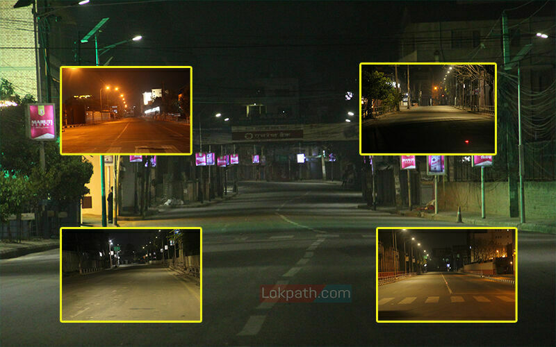 काठमाडौं । विश्वमा महामारीको रुपमा फैलिएको कोरोना भाइरस संक्रमणको जोखिम न्यूनिकरणका लागि सरकारले मंगलवारबाट देशभर लकडाउन गरेको छ । लकडाउनको तेस्रो दिनको साँझ काठमाडौं सुनसान देखिएको छ । रातमा सधैँ झुम्नेगरेको काठमाडौंको दरवारमार्ग, जमल तथा ठमेल आसपासका क्षेत्रहरु बेला सुनसान देखिएको छ ।