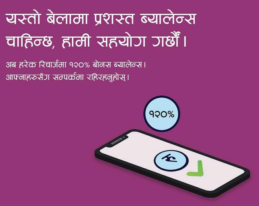 काठमाण्डौं । कोरोनाको कारण लकडाउनमा रहेका ग्राहकहरुलाई एनसेलले रिचार्ज गर्दा १२० प्रतिशत बोनस दिने भएको छ ।