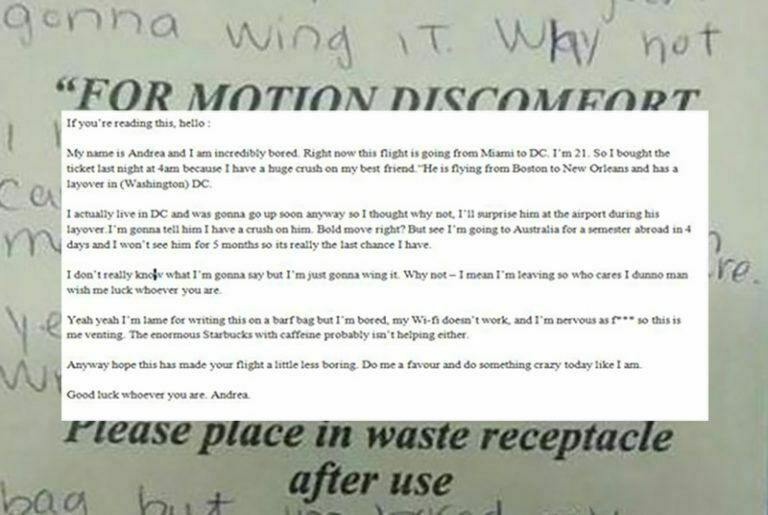 अमेरिकाकी एन्ड्रिया नाम गरेकी युवतीले यात्राका दौरानमा प्रेमपत्र लेखेर विमानको सिकनेस ब्यागमा फालेको अवस्थामा सफाइ गर्ने एक व्यक्तिले भेटाएका थिए ।
