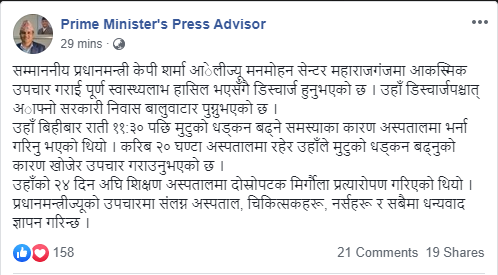 काठमाडौं। स्वास्थ्यमा समस्या देखिएर अस्पताल भर्ना भएका प्रधानमन्त्री केपी शर्मा ओली शुक्रवार साँझ डिस्चार्ज भएका छन् । मुटुको चालमा समस्या भएपछि १३ चैत राति अस्पताल भर्ना भएका थिए । पूर्णरुपमा स्वास्थ्य लाभ गरि प्रधानमन्त्री ओली घर फर्किएको प्रेस सल्लाहकार सूर्य थापाले जानकारी दिएका हुन् ।