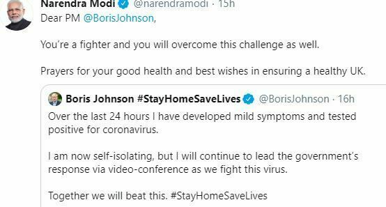 मोदीले ट्वीटरमा ट्वीट गर्दै लेखेका छन्, ‘तपाई एक योद्धा हो, र तपाईले यस चुनौतीलाई पनि जित्नुहुनेछ । तपाईको स्वास्थ्यका लागि प्रार्थना र स्वस्थ युके सुनिश्चित गर्नका लागि शुभकामना ।’