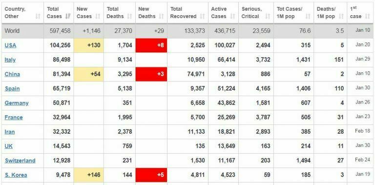 विश्वकै निमित्त ठूलो स्वास्थ्य चुनौती बनेको कोरोना भाइरसका कारण अहिलेसम्म २७हजार ३ सय ७० जनाको मृत्यु भइसकेको छ । त्यस्तै, ५ लाख ९७ हजार ४५८ जनालाई संक्रमण भएको छ । १ लाख ३३ हजार ३७३जना निको भएर घर फर्किएका छन् ।
