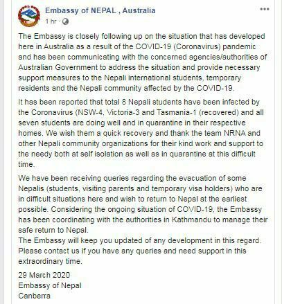 काठमाडौं । अस्ष्ट्रेलियामा अध्ययनरत ८ नेपाली विद्यार्थीलाई कोरोना भाइरसको संक्रमण भएको छ । अस्ट्रेलियास्थित नेपाली दूतावासले दिएको जानकारीअनुसार यो भाइरसबाट भिक्टोरियामा ३, न्यू साउथ वेल्समा ४ र तास्मेनियामा १ जनामा कोरोना भाइरसको संक्रमण देखिएको छ । जसमा तास्मेनियाका संक्रमित नेपाली विद्यार्थी निको भइसकेको दूतावासले जनाएको छ ।