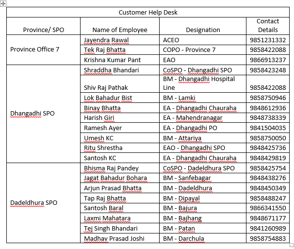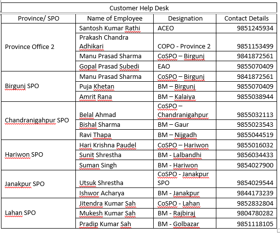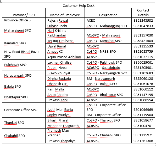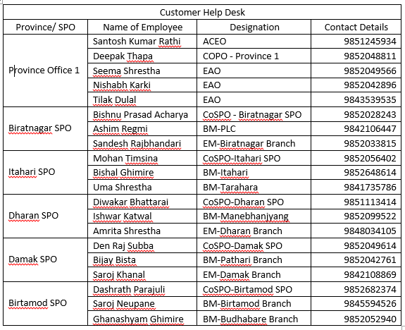 यसैगरी विराटनगर सहित इटहरी, धरान, दमक र विर्तामोडका कर्मचारीहरुलाई पनि त्यस क्षेत्रका ग्राहक महानुभावले फोन गरि बैंकिङ्ग समस्या समाधान गर्न सक्नेछन् ।