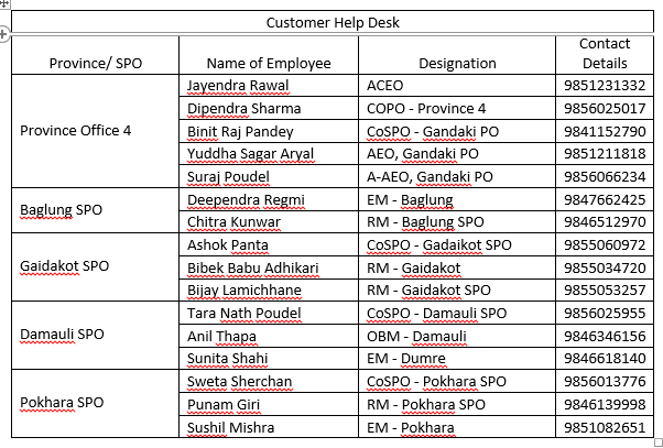 जस्तै, प्रदेश १ मा रहेका ग्राहक महानुभावले यस बैंकको प्रदेश १ कार्यालय प्रमुख दिपक थापालाई ९८५२०४८८११ नम्बरमा सोझै फोन गरेर आफ्नो बैंकिङ्ग समस्या बताई समाधानको उपाय प्राप्त गर्न सक्नेछन् ।