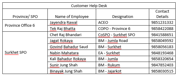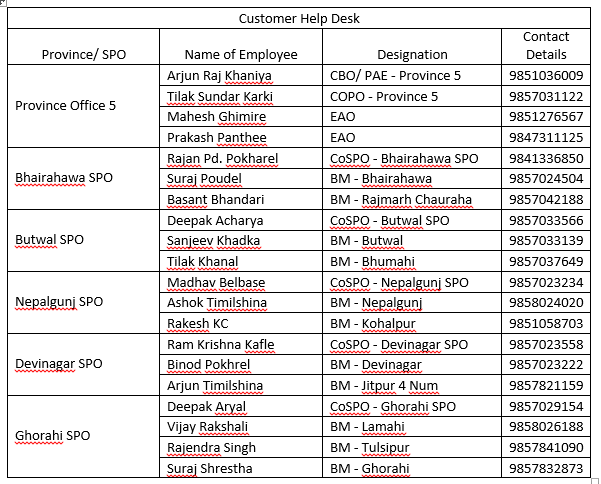 त्यसै अनुसार सातै प्रदेशमा स्थापना भएका ‘ग्राहक सहायता केन्द्र’ मार्फत ग्राहकहरुले आफ्नो बैंकिङ्ग समस्याको समाधान गर्न सक्नुहुनेछ जसका लागि बैंकले देहाएका ग्राहक सहायता केन्द्रहरु स्थापना गरेको छः