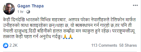 त्यहाँ रहेका नेपालीहरुले आफूलाई फोन गरि समस्या बताइरहेको र त्यसले गर्दा मन व्याकुल भएको बताएका छन् । आइतवार सामाजिक सञ्जाल फेसबुकमा लेख्दै सांसद थापाले सरकारसँग आग्रह गरेका हुन् ।